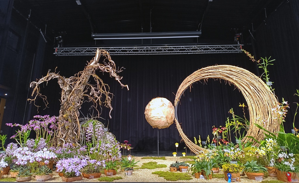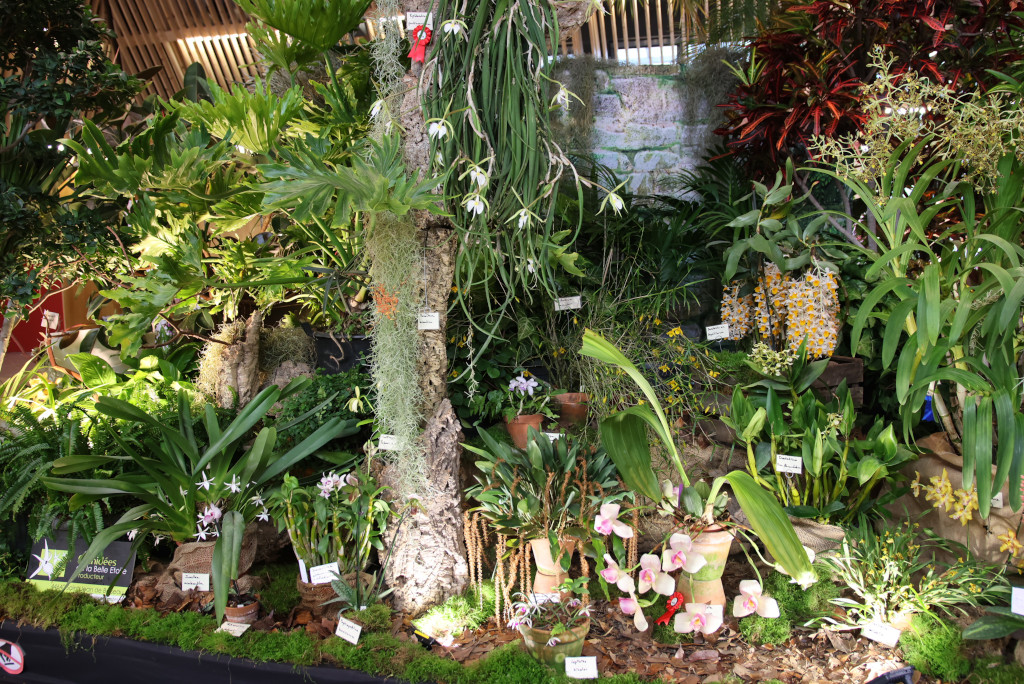 Le décor central occupe une bonne surface, occupée par les amateurs de la SOLO et trois producteurs d’orchidées, à savoir Les Orchidées de la Belle Étoile, L’Orchidium et La Cour des Orchidées. Les Serres du Sénat occupent l’estrade. Les cinq scènes étaient proposées au jugement. Le producteur Ecuagenera n’a pas proposé de décor.